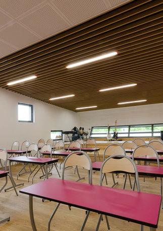 Celui-ci est traité comme une vaste nef chaleureuse avec son plafond en bois à l’élégante charpente et ses coursives latérales qui distribuent les classes à l’étage et où sont accrochés en porte à faux les « boites » colorées de locaux annexes.
