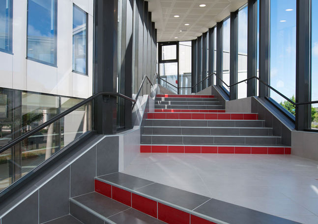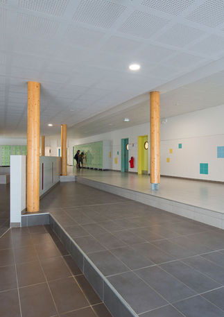 Le corps principal du bâtiment abrite les salles de cours. Un volume se détache à l’est et abrite l’administration et la vie scolaire. Il matérialise le parvis traité en pente régulière incrusté de surfaces horizontales en pierres dont les bords forment gradins pour rattraper la pente en se prêtant à de multiples appropriations.